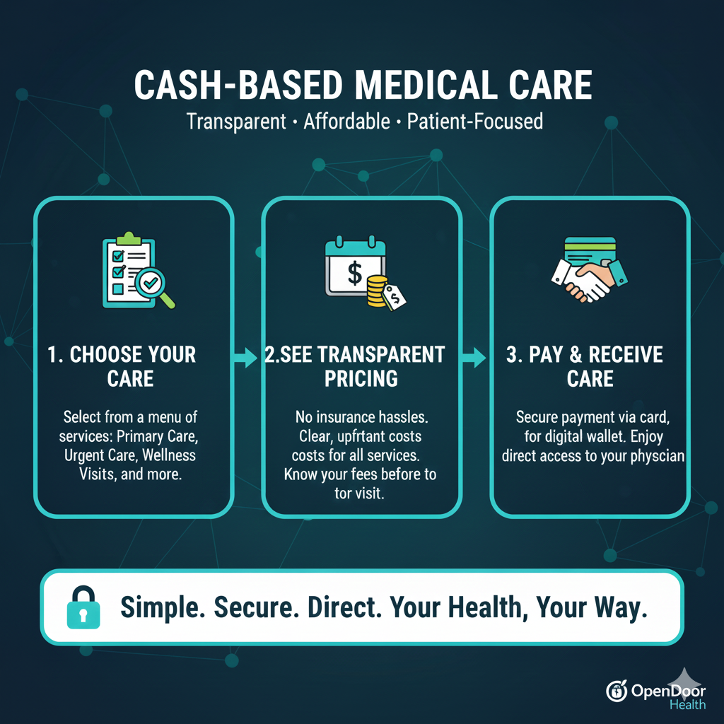 OpenDoor Virtual Medicine is a cash‑pay medical consultation service. Fees are clearly stated upfront so you know the cost before you schedule. We do not bill insurance.